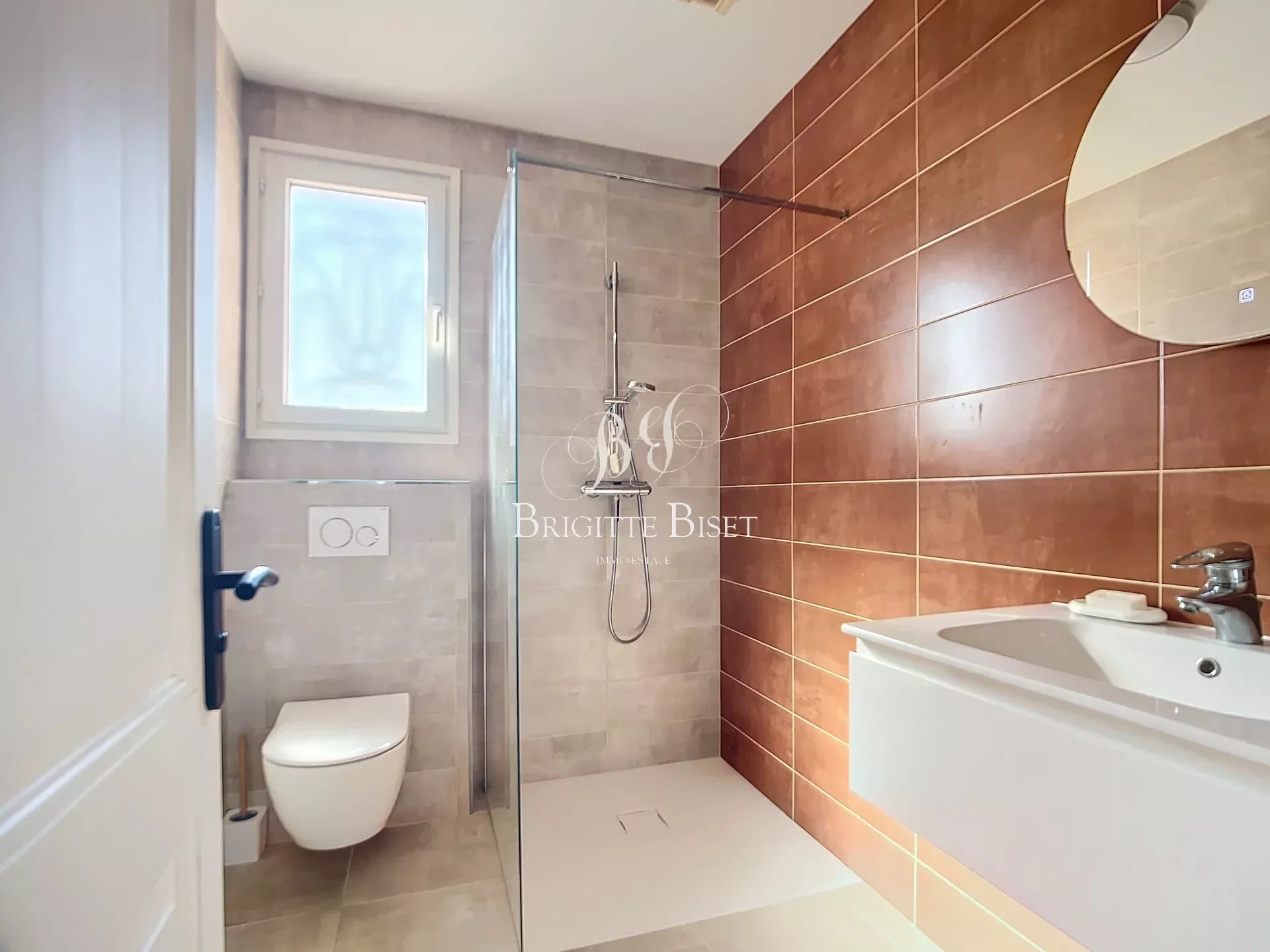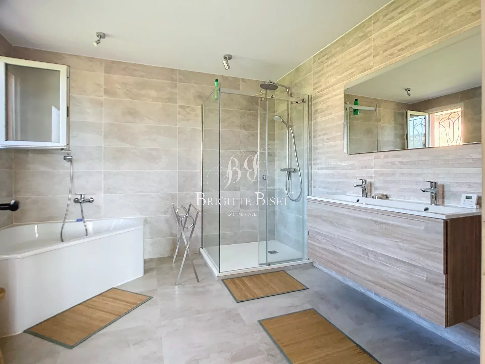 Cette agréable villa propose au niveau de l’entrée une grande chambre parentale ouverte sur solarium, avec salle de bains (double vasque, douche, baignoire, toilettes séparées), 2 chambres, salle de douche/toilettes, et garage.