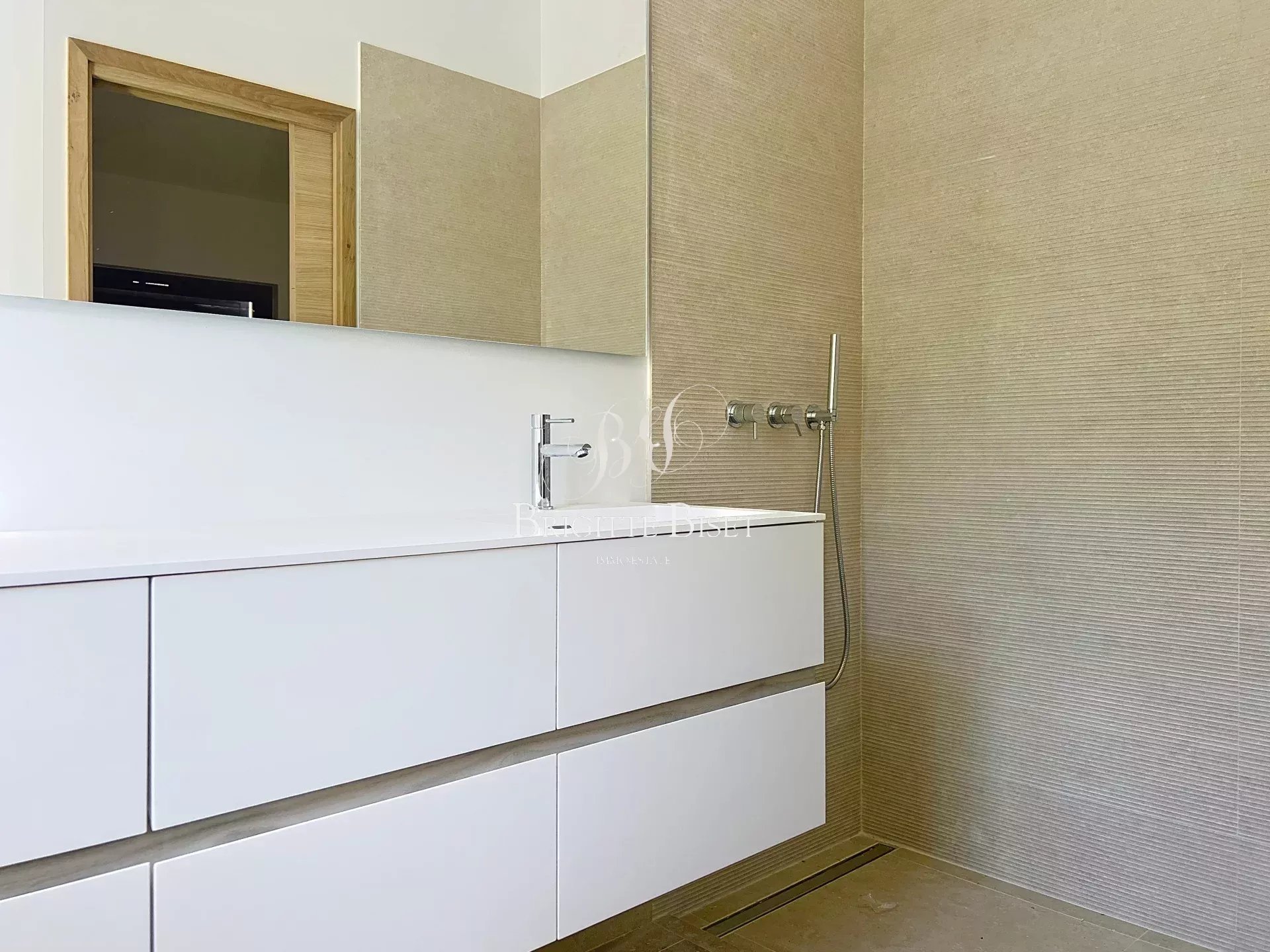 Entrée, toilette invitée, séjour avec cheminée, cuisine ouverte non équipée, donnant sur une immense terrasse couverte, 2 chambres de plain pied, deux salles de douche et toilette, buanderie. 1ere étage: 2 chambres, une salle de douche et toilette, solarium, garage et 2 parkings. Piscine à débordement 10x4m chauffée avec un rideau électrique. Exposition sud/ouest. Climatisation réversible, tout à l'égout.