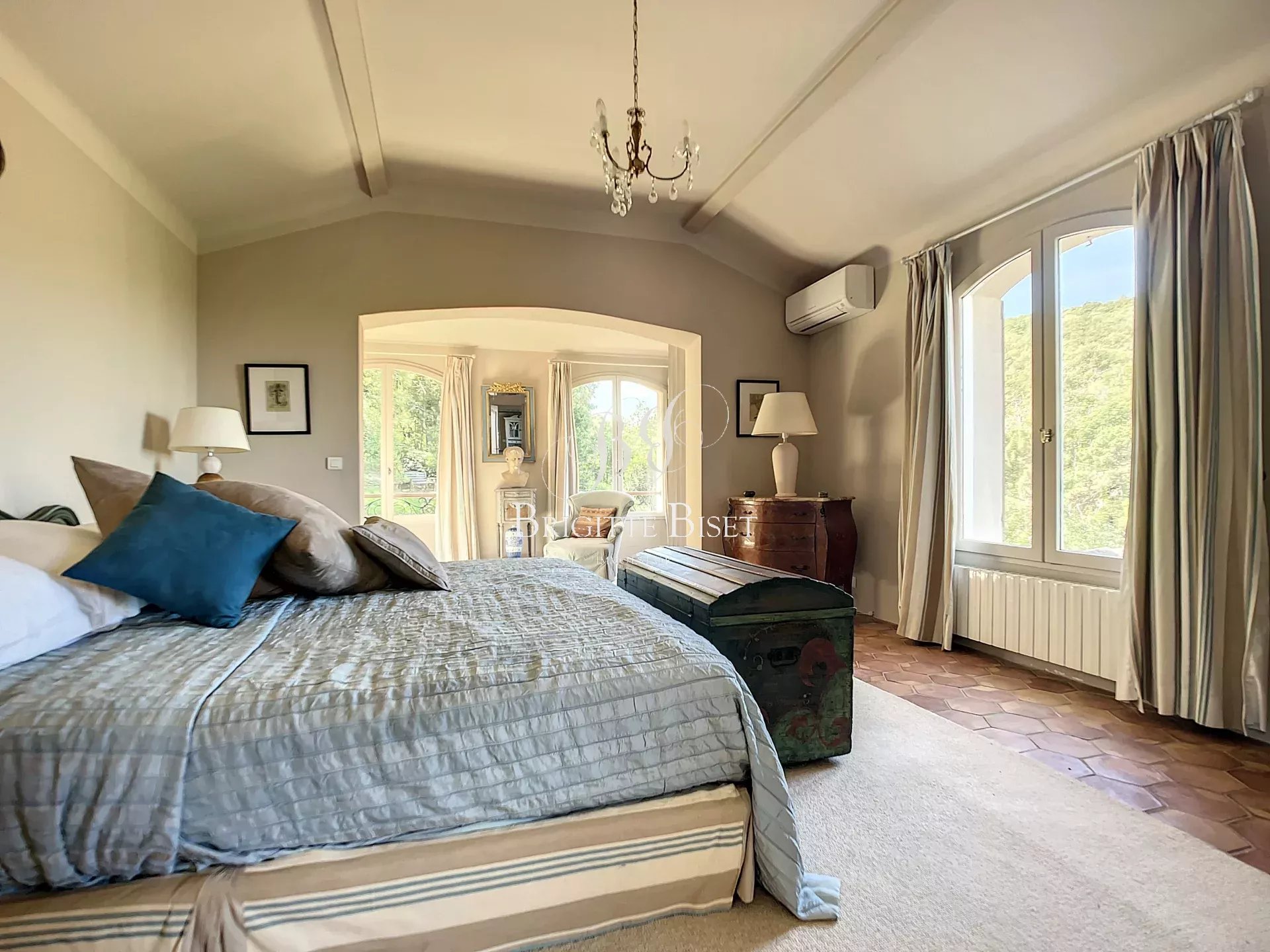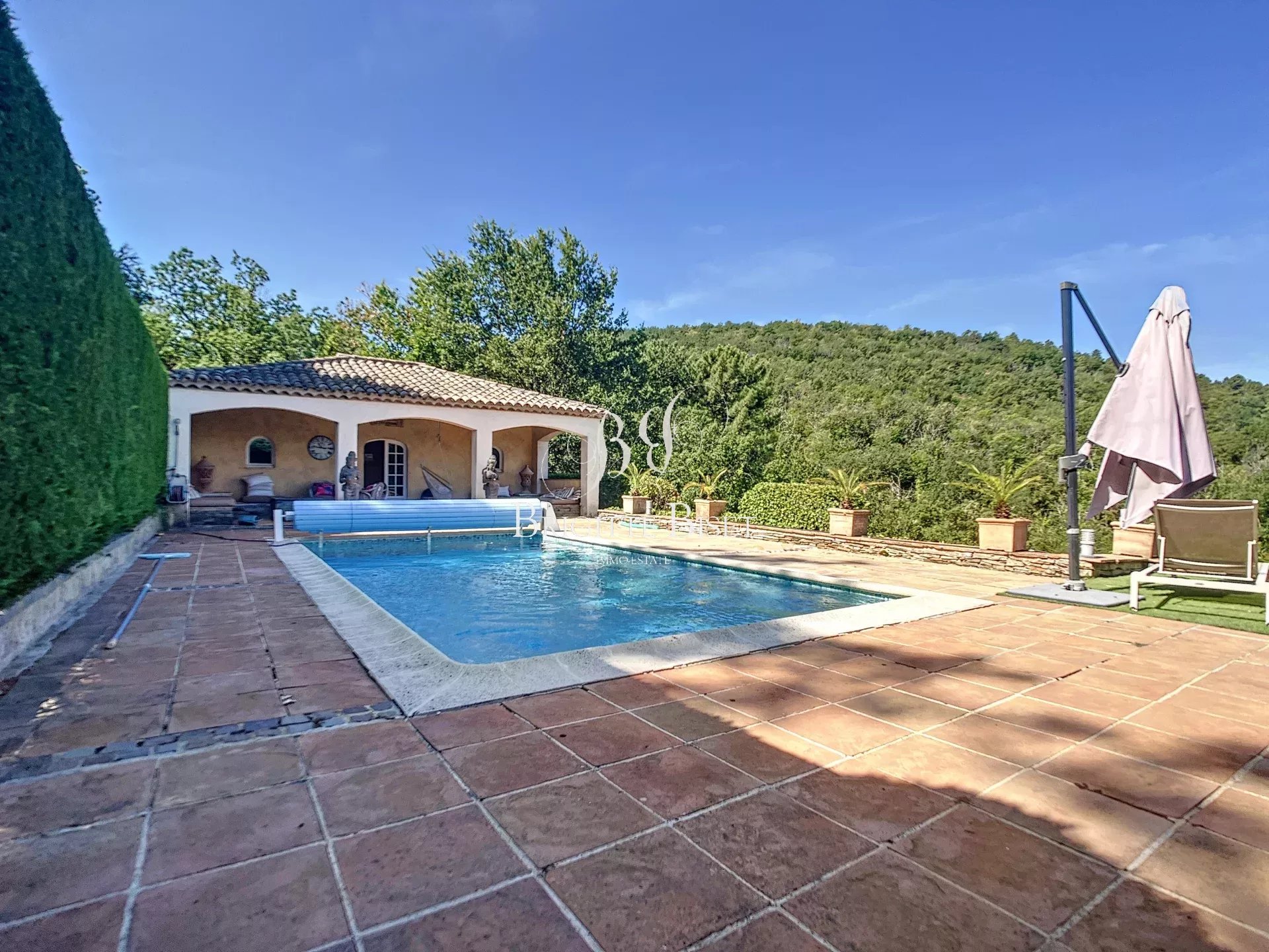 Villa à vendre à La Garde Freinet. Superbe propriété avec une vue imprenable nichée sur les collines de la baie de Saint Tropez à seulement 5 minutes du charmant village historique de La Garde Freinet. Cette belle villa orientée ouest est située sur un terrain de 2,5 hectares avec de beaux espaces extérieurs pour recevoir et se détendre. La bastide principale comprend 5 chambres et 4 salles de bains, un hall d'entrée, un salon et une salle à manger avec cheminée, sa cuisine ainsi qu'un salon séparé avec cheminée donnant sur les terrasses et une belle pergola. Au même niveau, les 3 spacieuses suites de chambres à coucher. A l'étage la suite parentale et une chambre d'amis supplémentaire avec un bureau qui peut être utilisé comme une chambre supplémentaire. Double garage et buanderie à côté de la villa, cave à vin. Une piscine avec son pool house comprenant un sauna et une salle de sport ainsi qu'une douche et des toilettes. Un grand garage supplémentaire pour 2 voitures avec atelier et héliport est situé en dessous de la villa. Possibilité d'ajouter des installations sportives comme un court de tennis et de réhabiliter un cabanon qui figure sur les cartes cadastrales.