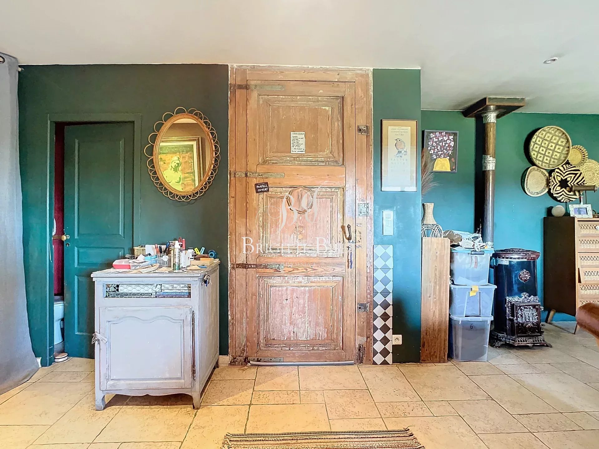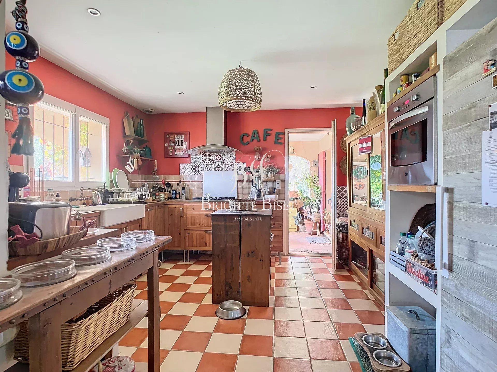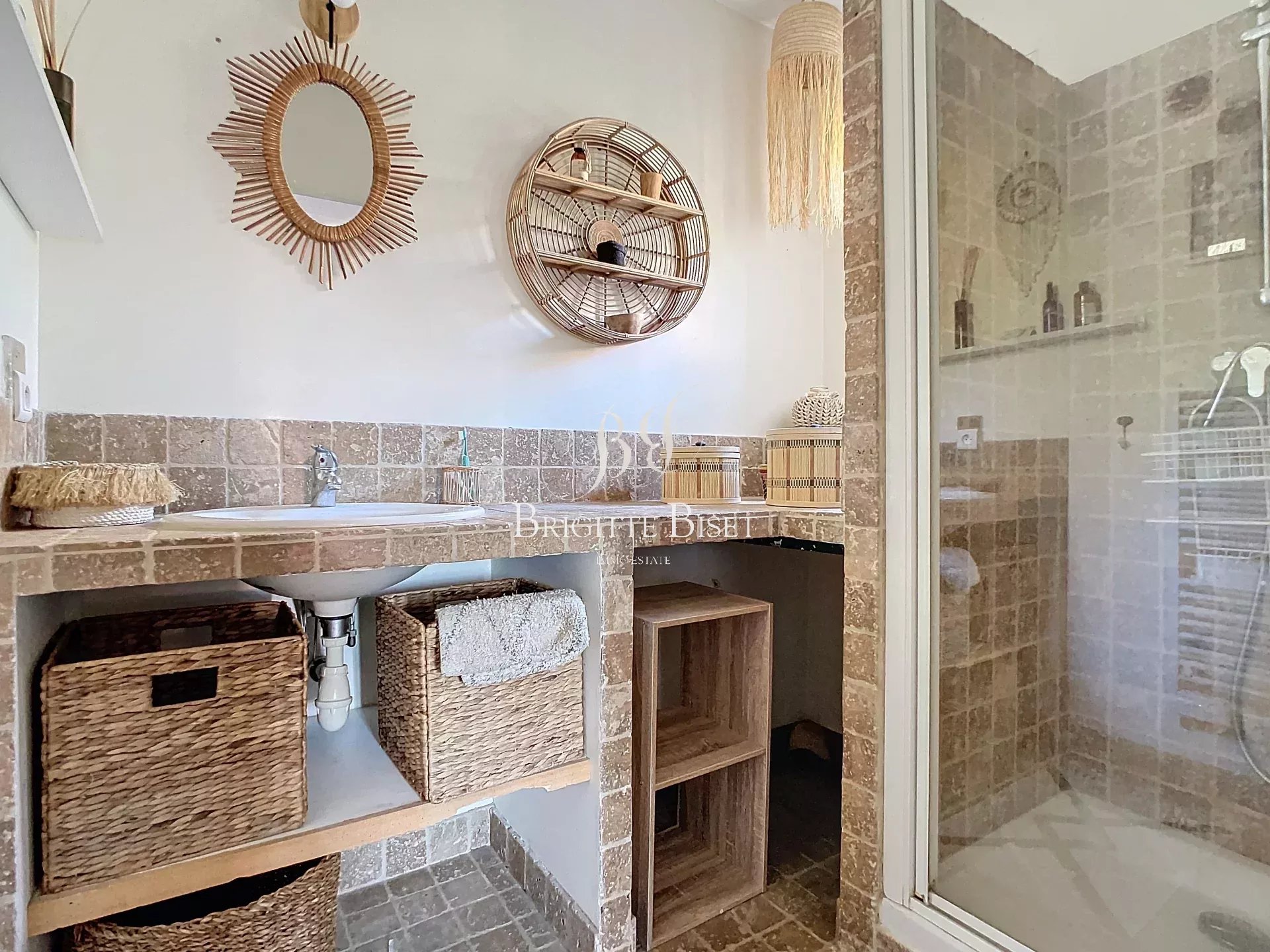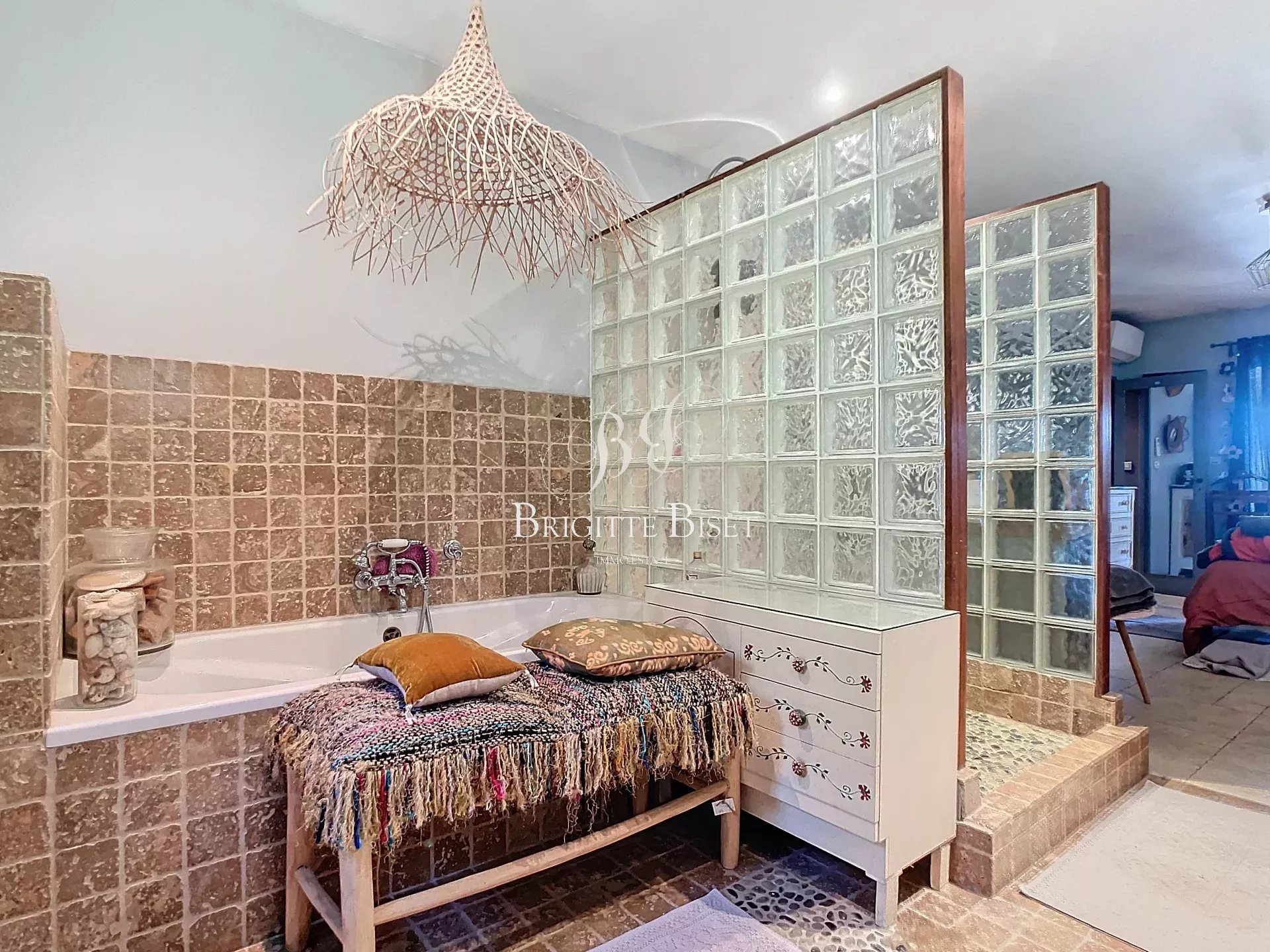 This very pretty house of 175m2 style "Bohème chic" on two levels offers entrance with closet, guest toilet and wash hands, living room/ lounge with wood stove Godin and reversible air conditioning, fully equipped kitchen and opening onto beautiful covered terrace, a Master bedroom with bathroom, shower, toilet and walk-in closet.