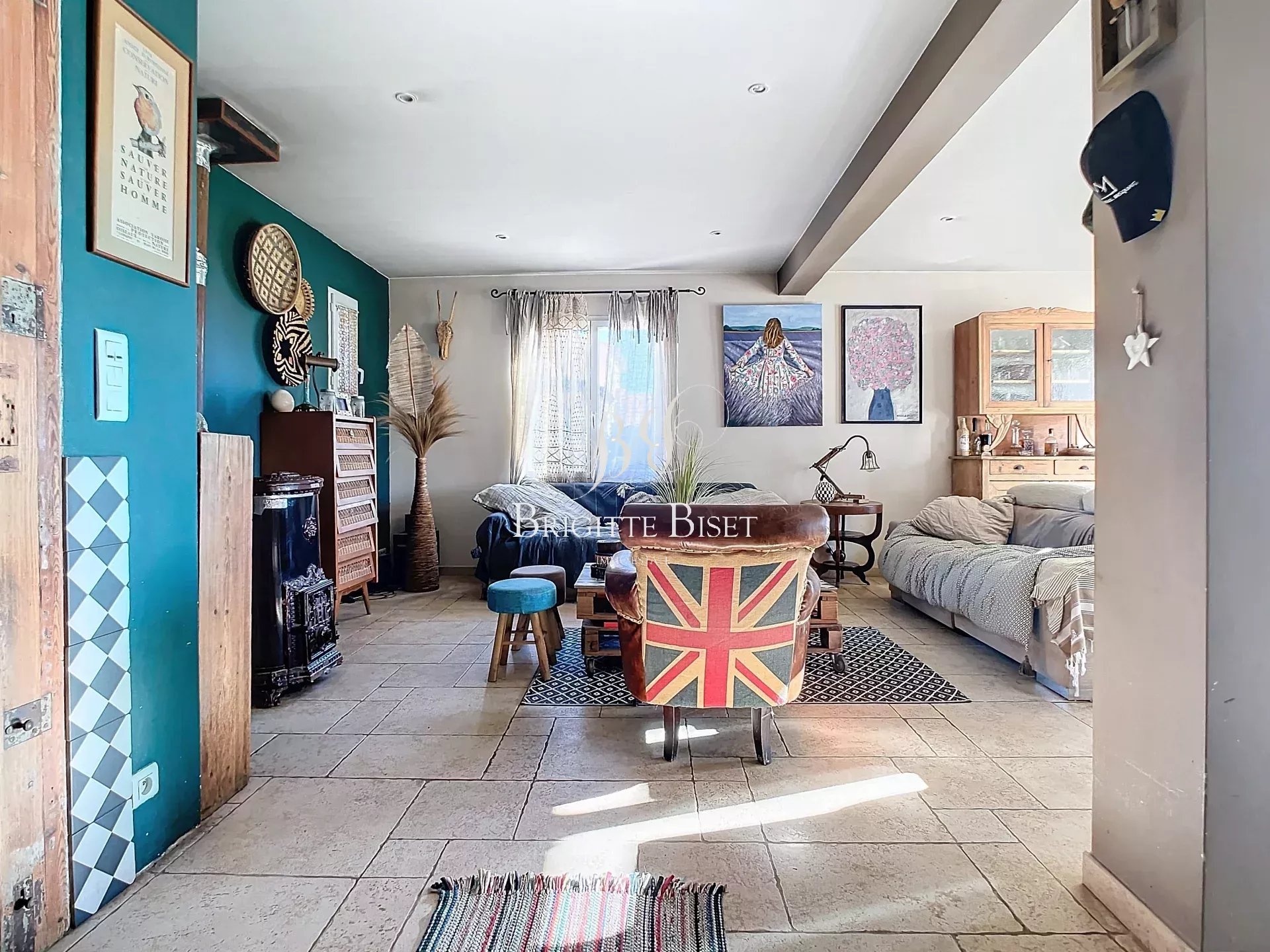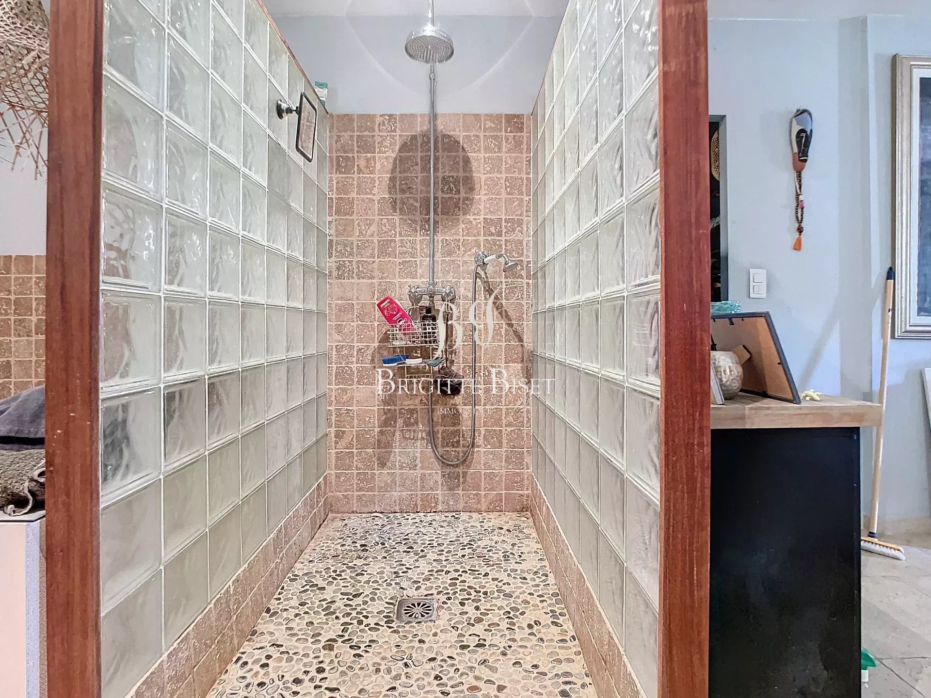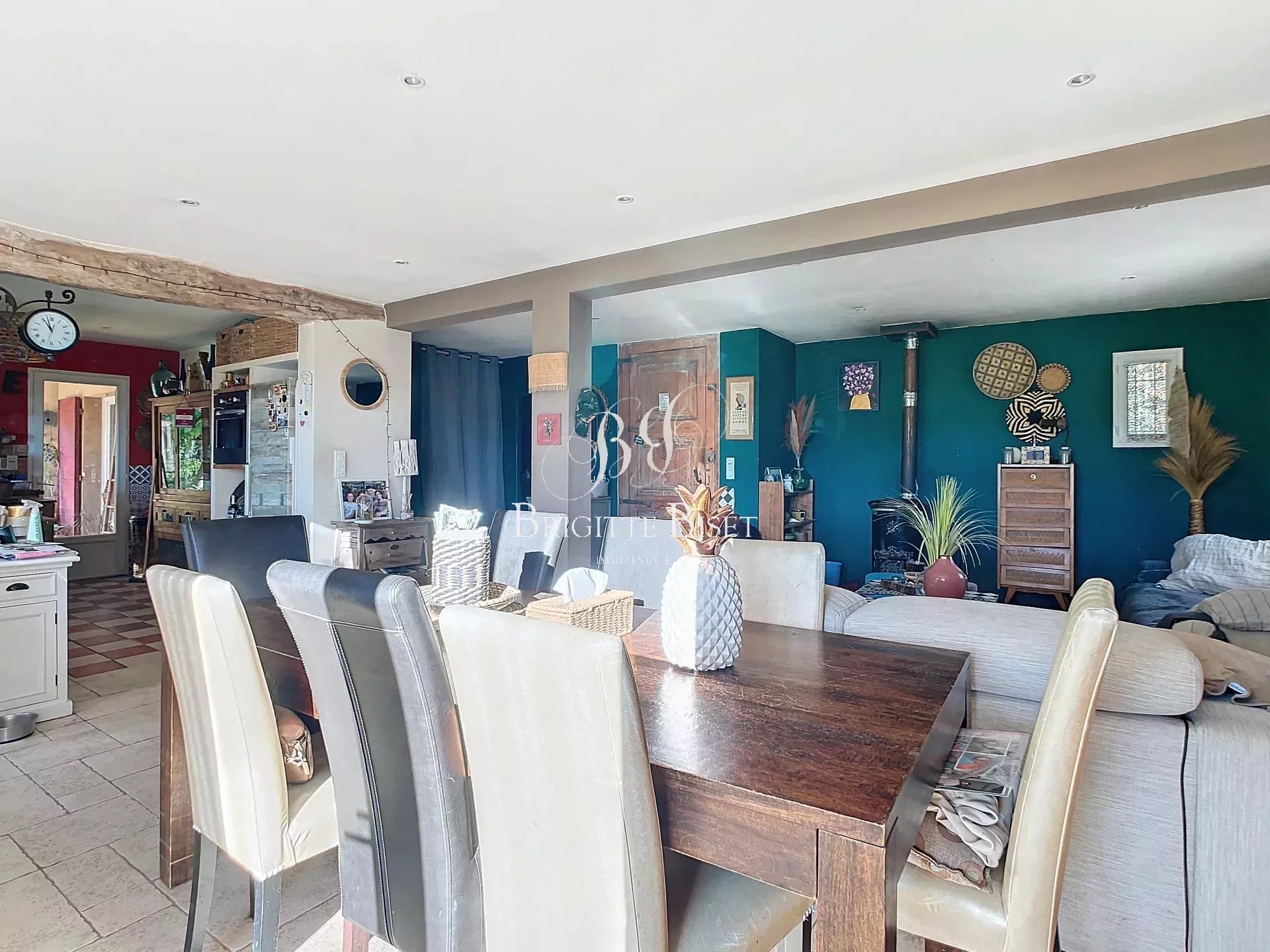This very pretty house of 175m2 style "Bohème chic" on two levels offers entrance with closet, guest toilet and wash hands, living room/ lounge with wood stove Godin and reversible air conditioning, fully equipped kitchen and opening onto beautiful covered terrace, a Master bedroom with bathroom, shower, toilet and walk-in closet.