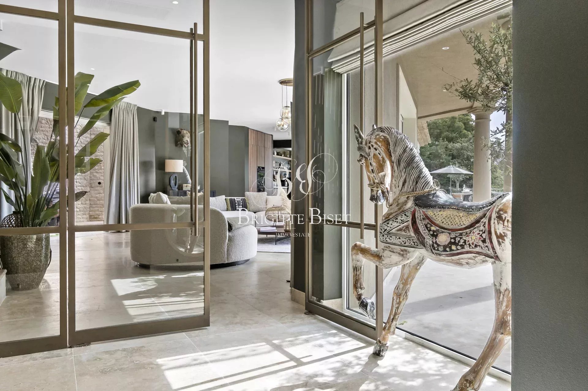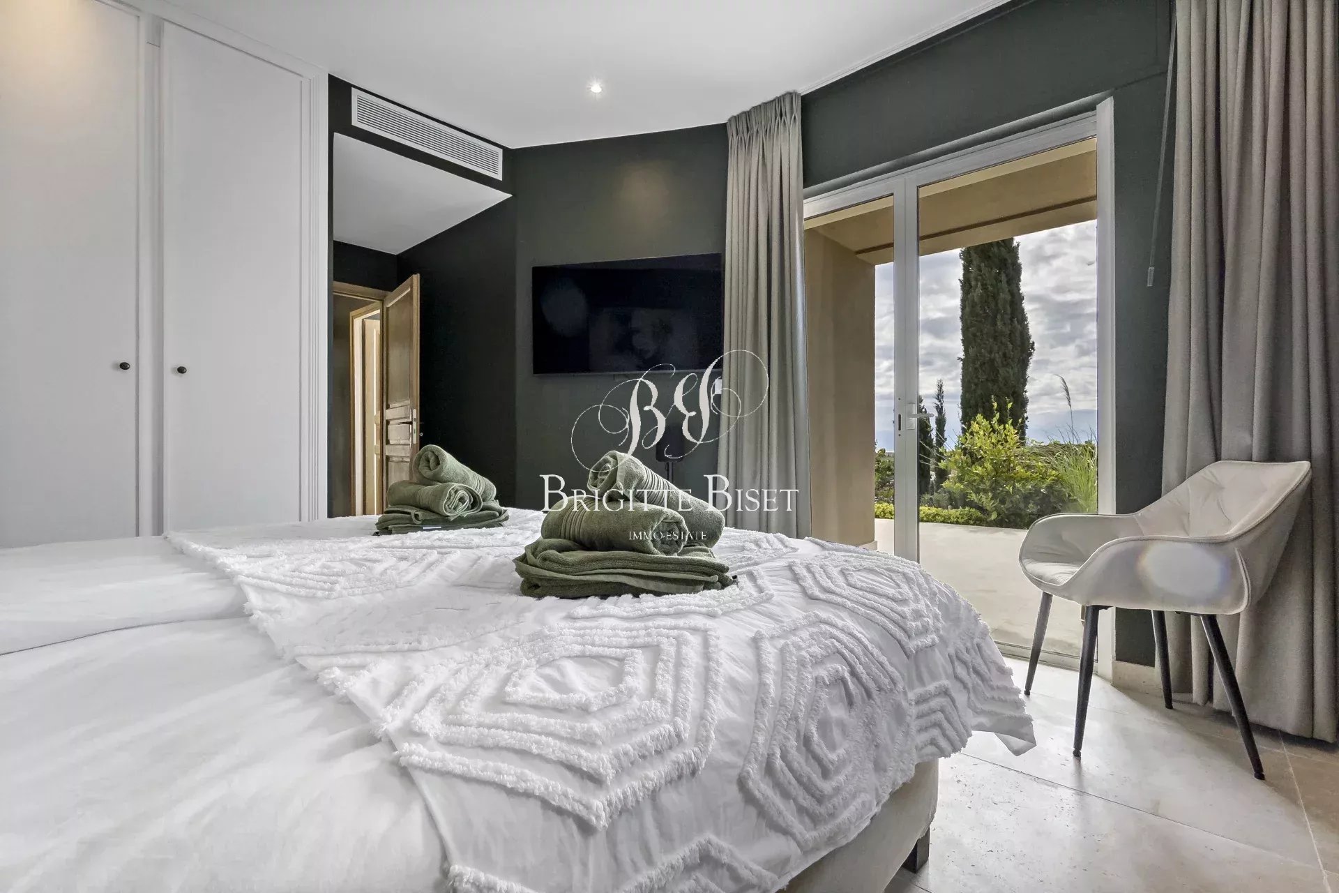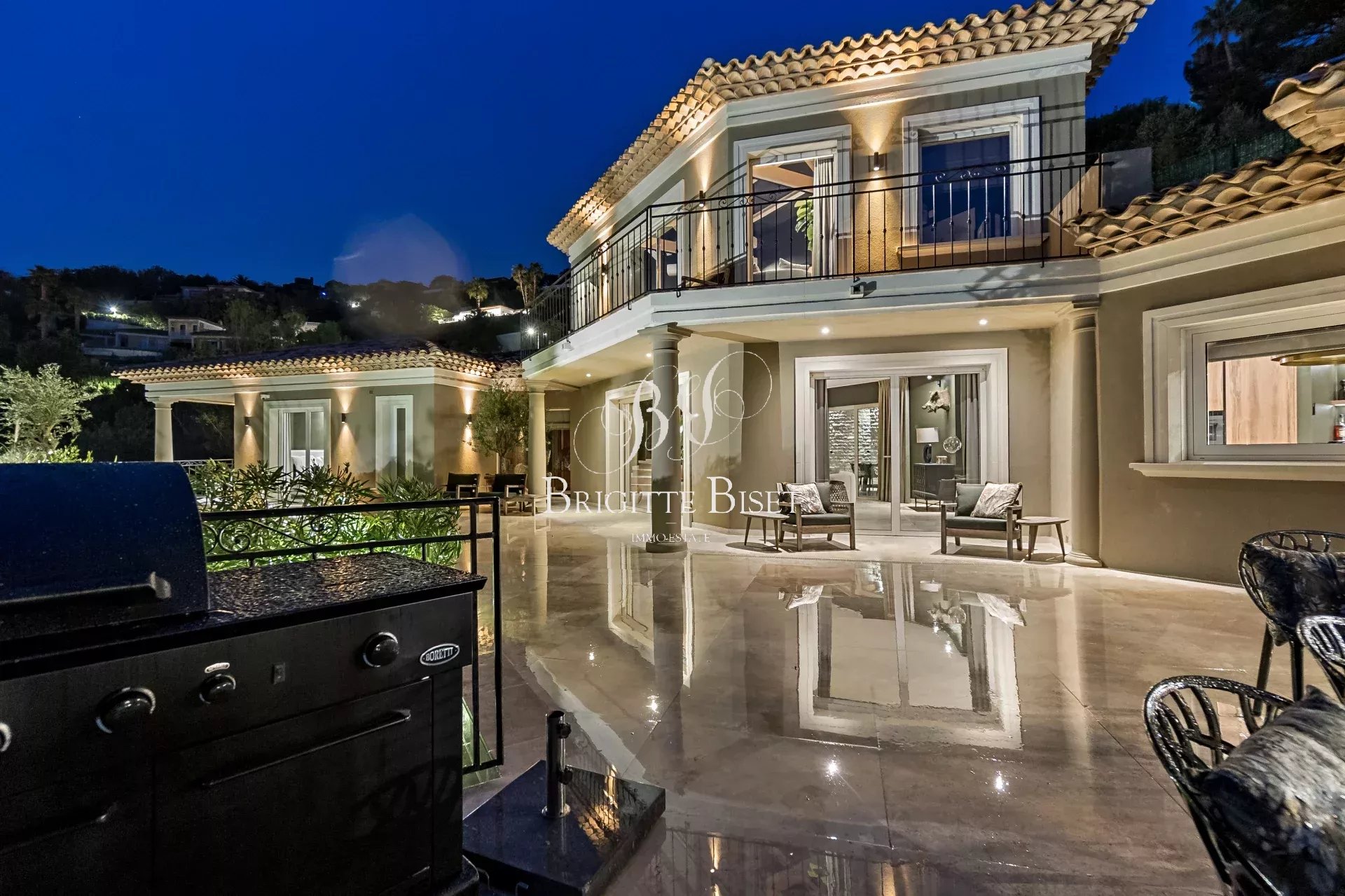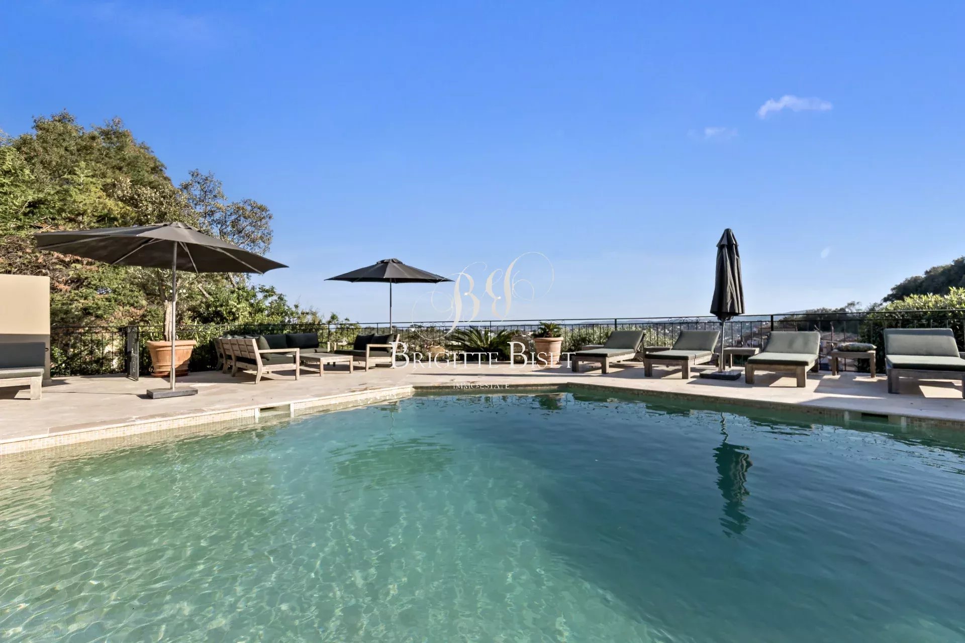 Villa te koop in Sainte Maxime met zeezicht. De villa is volledig gerenoveerd, met hoogwaardig bouwmaterialen, op een stukgrond van 4.150m² nabij golfbaan van Sainte Maxime met prachtig zicht over de golfbaan en zeezicht. De villa biedt: entree hal, woonkamer, prachtige ruime keuken, eetkamer die uitkomt het verwarmde zwembad en terras, gelijkvleors twee slaapkamers met elk eigen douche, boven bevindt zich de ouderslaapkamer met badkamer, dressing en terras, op tuinniveau een mooie slaapkamer met douche, wasruimte. Er zijn twee slaapkamers met eigen douche en pantry in een bijgebouwde met eigen entrée. Parkeerplaatsen voor meerdere auto's. Reversible air conditioning, automatische poort, bewatering, alarm.
